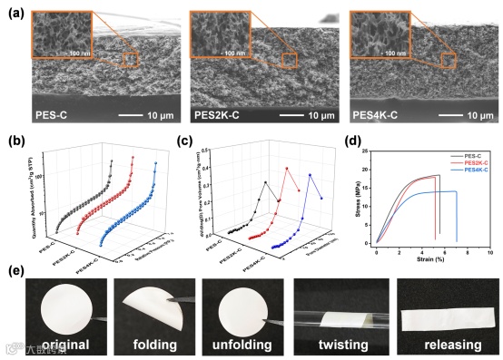 图3. (a) 隔膜的横截面SEM图,(b) N2吸附-解吸附等温线,(c) 孔径分布,(d) 应力-应变曲线,(e) PES2K-C隔膜展示