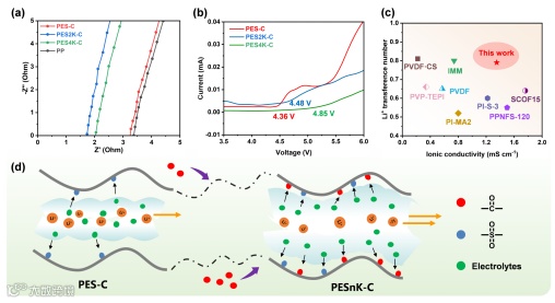 图5. (a) 奈奎斯特图,(b) LSV曲线,(c) 对比图,(d) 引入羰基后PESnK-C隔膜的离子传输示意图