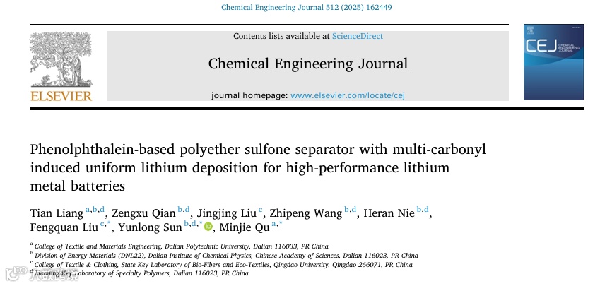 Tian Liang, Zengxu Qian, Jingjing Liu, Zhipeng Wang, Heran Nie, Fengquan Liu *, Yunlong Sun*, Minjie Qu*, Phenolphthalein-based polyether sulfone separator with multi-carbonyl induced uniform lithium deposition for high-performance lithium metal batteries, Chemical Engineering Journal 2025, 512, 162449