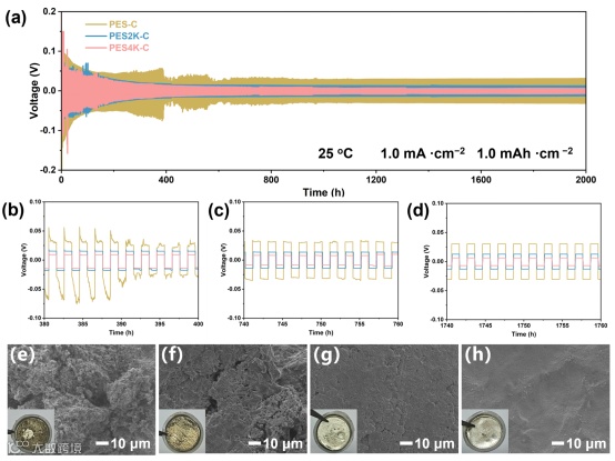 图8. (a~d)在1.0 mA cm −2和1.0 mAh cm −2下,隔膜的锂离子嵌入/脱嵌,(e) PP (f) PES-C (g) PES2K-C (h) PES4K-C隔膜电池循环2000小时后锂电极表面照片和SEM图