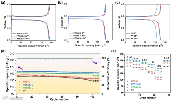 图9. (a) PES2K-C (b) PES4K-C (c) PP在0.5 C下的充放电曲线,(d) 0.5 C下长期循环性能 (e) 倍率性能