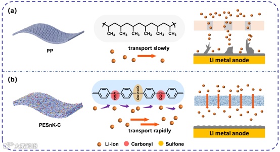 图1. (a) PP和 (b) PESnK-C隔膜在LMB中锂离子的迁移和锂沉积的机理示意图