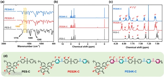 图2. 聚合物的 (a) ATR-FTIR谱图和 (b) 1H NMR谱图,(c) 和 (d) 质子峰归属