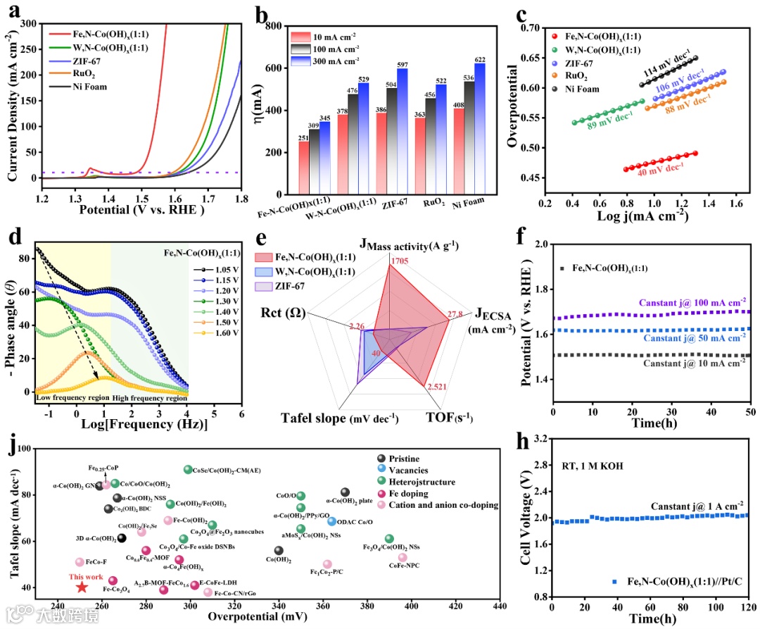 实验结果表明,Fe,N-Co(OH)x催化剂表现出优异的OER性能。其质量活度达到1705 Ag⁻¹,转化频率为2.521 s⁻¹,分别比W,N-Co(OH)x高80.4倍和57倍(21.2 Ag⁻¹ 和 0.044 s⁻¹)。这一显著的性能提升,为电解水制氢技术的高效化提供了有力支持。