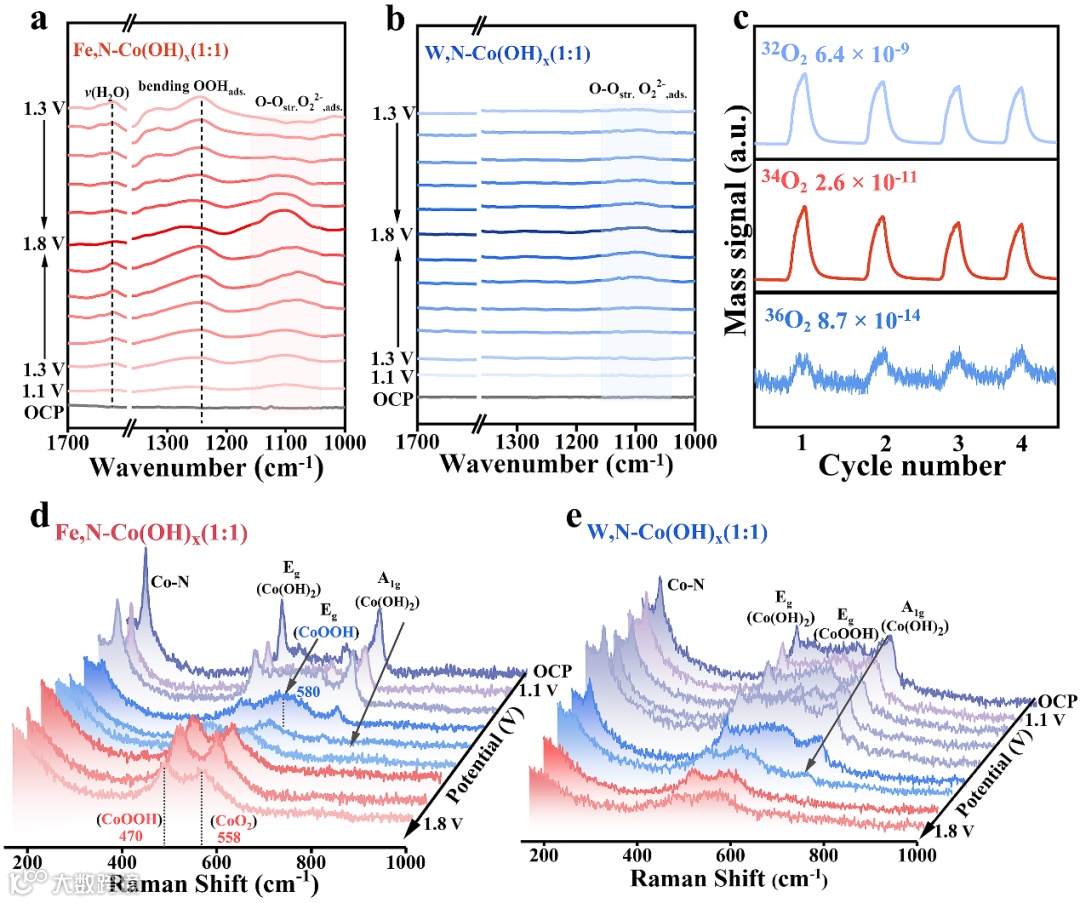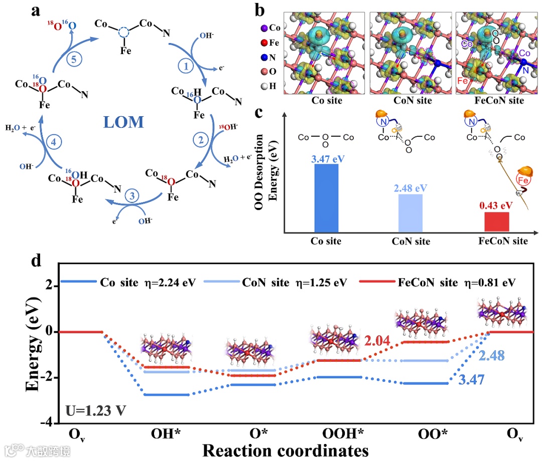 更为重要的是,研究人员通过实验和理论计算,揭示了N-Co-O-Fe界面调节了Fe,N-Co(OH)x中Co的d带中心,降低了OER过程限制步骤OO*解吸形成氧空位的能垒,并为活性氧空位上的晶格氧机制(LOM)提供了直接证据。这一发现不仅为设计高性能电催化剂提供了新的思路,特别是在激活晶格氧机制(LOM)方面取得了重要进展,也为未来电解水制氢技术的工业化应用提供了理论基础和技术支持。