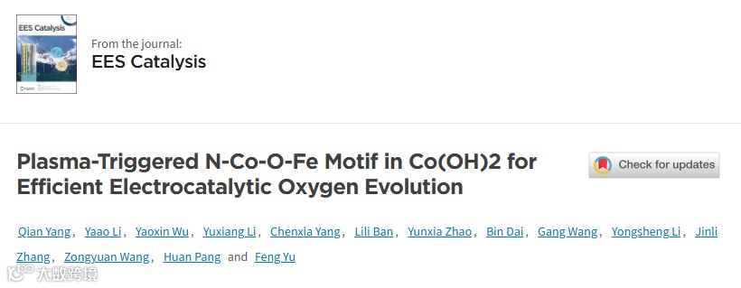 该研究成果以“Plasma-Triggered N-Co-O-Fe Motif in Co(OH)₂ for Efficient Electrocatalytic Oxygen Evolution(https://doi.org/10.1039/D4EY00280F)”为题发表在国际知名期刊EES Catalysis上。论文第一作者是石河子大学化学化工学院研究生杨茜和李亚奥,通讯作者是王宗元副教授、庞欢教授和于锋教授。