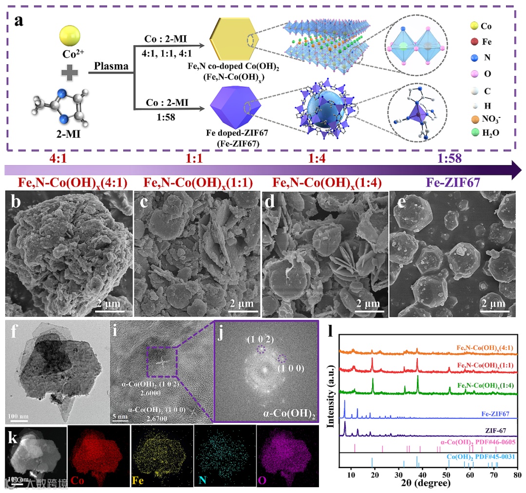 图1. Fe,N-Co(OH)x的合成示意图以及形貌结构.