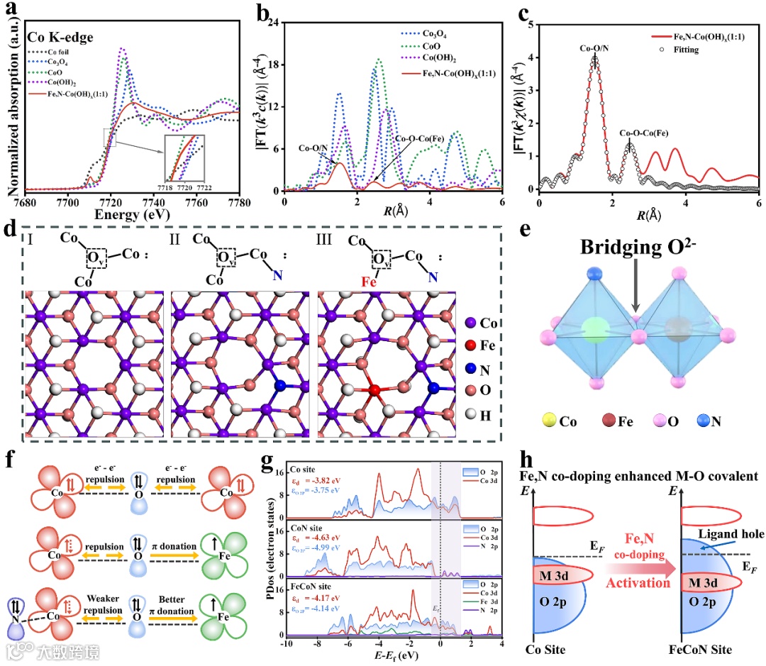 研究人员通过溶液等离子体法,巧妙地将金属Fe和非金属N共掺杂到Co(OH)₂中,形成了独特的N-Co-O-Fe界面。Fe掺杂增强了催化剂的导电性,促进了电子转移能力,并加速了表面重构;而N掺杂则优化了OH的吸附能力,并降低了OO的解吸能。这种共掺杂策略不仅提升了催化剂的导电性和电子转移能力,还通过加速电子从Co原子向Fe原子的再分布,促进了活性高价Co(IV)的形成,增加了金属-O的共价性,从而优化了氧中间体的吸附和解吸过程。