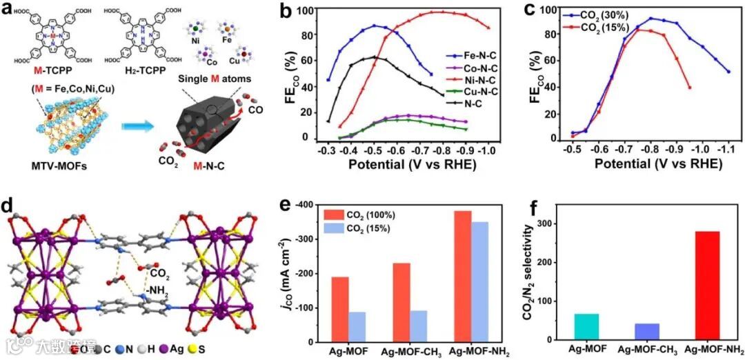 目前进行低浓度电催化CO2还原的设计策略,可以简单总结包括三种。(1)利用多孔、高比面积催化剂,来物理吸附富集CO2,来提高催化剂表面附近的CO2浓度,促进CO2RR动力学。(2)在催化剂表面修饰特定的CO2吸附官能团,来提高与CO2的化学键合作用。(3)与有机分子、聚合物等进行耦合,形成复合催化剂。例如,将Ni-N-C催化剂与离子液体进行复合,利用有机链的物理吸附和咪唑基团的化学吸附作用,协同提高局域CO2浓度。