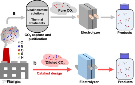 通过电催化CO2还原技术将CO2转化为碳基燃料和化学品,为实现碳中和目标提供了一条极具前景的减排路径。目前大部分的研究都是采用高纯CO2作为气体原料,而工业烟道气作为CO2的主要排放来源,所包含的CO2浓度较低,约为5~15%。这就意味着需要先对低浓度CO₂进行捕获与富集,然后进行电催化CO2还原反应,这将大大增加了工艺流程和生产成本。