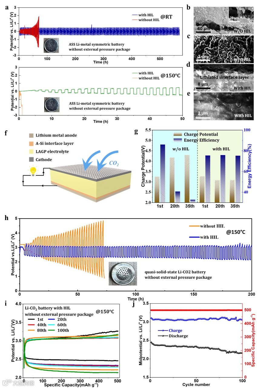 图4.锂金属电池的循环性能与表征。a)在RT以及超过150℃的HT下,电流密度为0.1 mA cm⁻²时,有/无HIL的锂对称电池的循环性能。b)在RT下循环后,无HIL的LAGP的横截面SEM图像。c)室温下循环后,无HIL的LAGP的平面SEM图像。d)在RT下循环后,有HIL的LAGP的横截面SEM图像。e)在RT下循环后,有HIL的LAGP的平面SEM图像。f)无外部压力封装且带有HIL的Li-CO₂电池的示意图。g)在150℃、电流密度为500 mA g⁻¹、容量限制为500 mAh g⁻¹的条件下,有/无HIL的固态Li-CO₂电池的能量效率。h)在150℃下运行时,有/无HIL的Li-CO₂电池的电压-时间曲线。i、j)带有HIL的Li-CO₂电池在150℃下的电化学循环性能。