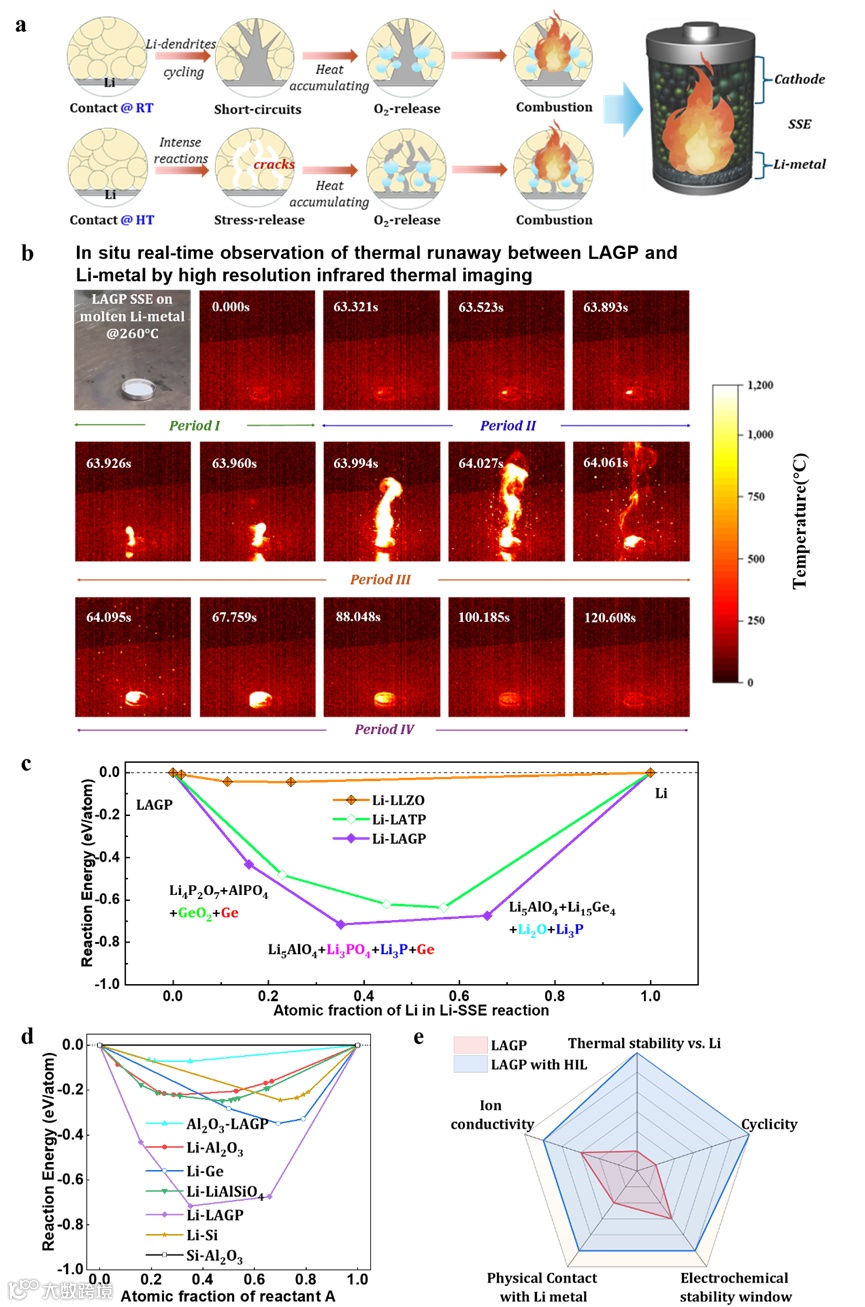 图1.含LAGP的固态锂电池的热失控情况。a)固态锂电池中热失控的两种路径的示意图。b)热失控的系列热红外图像(作为时间的函数)。c)Li-SSE界面之间计算得出的反应能。最大反应能对应于反应Li+Li1.5Al0.5Ge1.5(PO4)3→Li5AlO4+Li3PO4+Li3P+Ge。d)各种A-B界面之间计算得出的反应能。e)改性前后的性能对比。