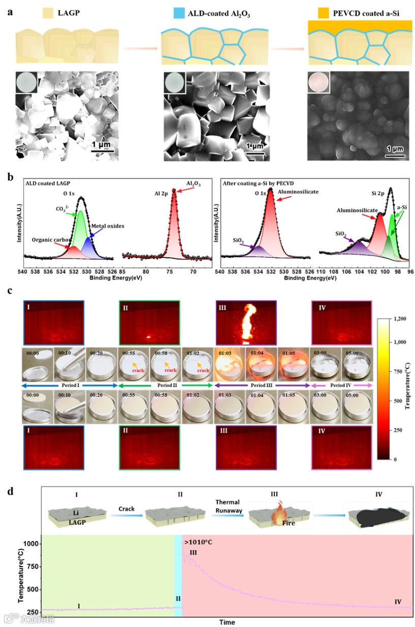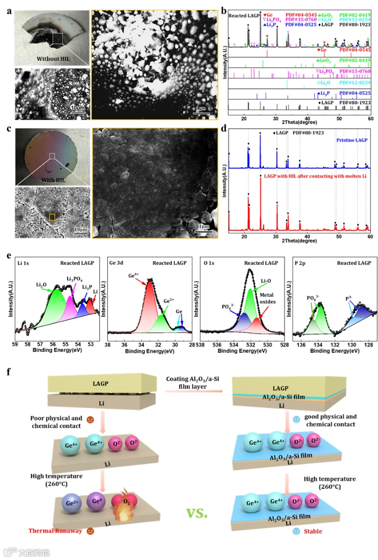 图3.热失控实验后有/无Al₂O₃和a-Si HIL的LAGP的表征。a)热失控实验后,无HIL的原始LAGP的数码照片和SEM图像。b)热失控实验后,无HIL的原始LAGP的XRD图谱。c)热失控实验后,有HIL的LAGP的数码照片和SEM图像。d)热失控实验后,有HIL的原始LAGP的XRD图谱。e)热失控后产物的XPS图谱。f)负极界面改性抑制热失控的原理示意图。