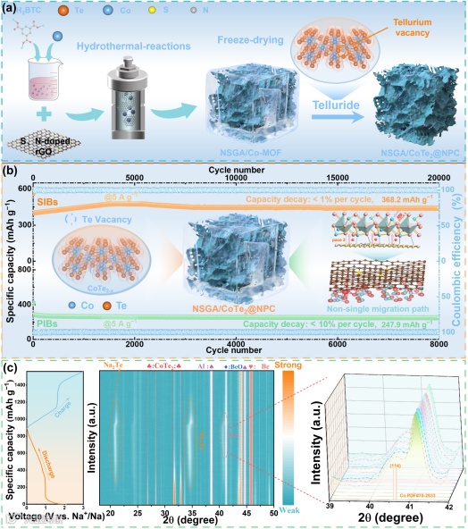 以 Co-MOF 为模板,合成出具有大量碲空位的 CoTe2纳米粒子,并将其限制在掺氮和掺硫的 GA 框架中(称为NSGA/CoTe2@NPC),作为高性能 SIB/KIB 的负极。首先,Co-MOF衍生的CoTe2纳米粒子均匀地生长在GA中,提供了丰富的可访问活性位点,充分释放了CoTe2的理论容量。其次,S-掺杂和N-掺杂的GA具有连续的三维网络和高导电性,不仅能增强材料的导电性和缓解循环过程中的体积膨胀,还能缩短离子/电子传输路径。第三,丰富的碲空位不仅增强了其导电性,还提供了丰富的活性位点,从而在SIBs和PIBs中都具有优异的电化学性能。