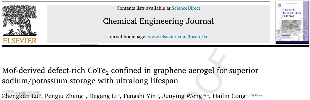 近日,来自山东理工大学的丛海林教授与翁俊迎副教授,在国际知名期刊Chemical Engineering Journal上发表题为“MOF-derived defect-rich CoTe2 confined in graphene aerogel for superior sodium/potassium storage with ultralong lifespan”的观点文章。本文报道了一种结合模板辅助策略的原位生长法,以获得限制在石墨烯气凝胶(GA)框架中的CoTe2纳米粒子(称为 NSGA/CoTe2@NPC),作为高性能SIB/KIB的负极。