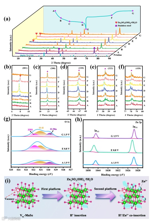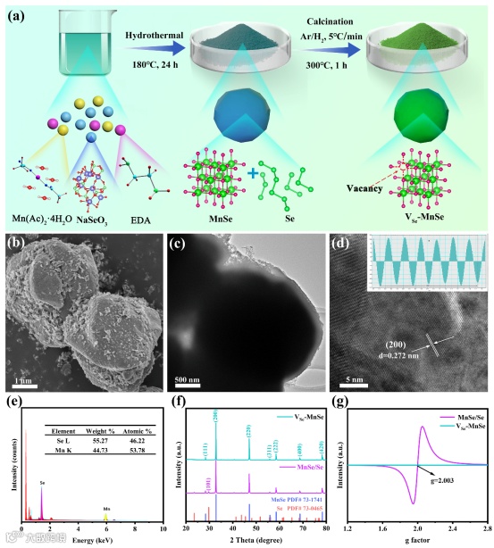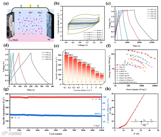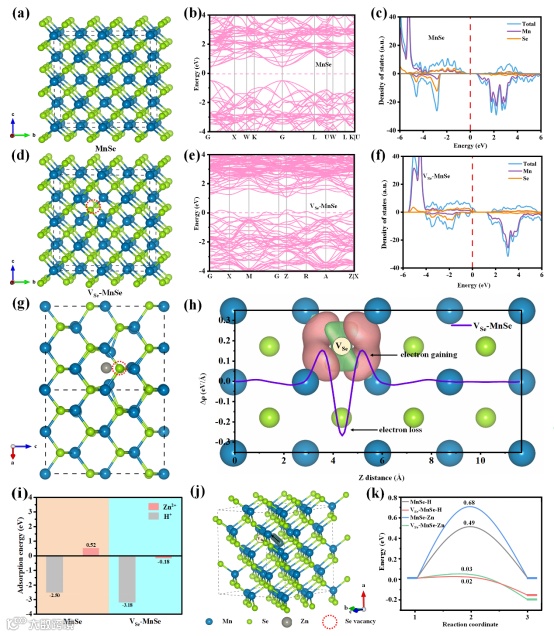 鉴于此,湖南工业大学朱裔荣教授和中国科学院深圳先进技术研究院彭超副研究员等人采用水热法和高温煅烧合成了富硒空位的MnSe微球(VSe-MnSe),并首次作为水系锌离子电池/电容器正极材料。DFT计算和动力学分析表明,空位工程增强了MnSe的活性位点,提高了电子导电性和离子传输能力,降低了H+和Zn2+的吸附能和扩散能势垒,使其表现出显著增强的比容量、倍率性能和循环稳定性。同时,本工作通过系统的非原位表征证实了VSe-MnSe在整个充放电过程中的稳定存在,并表现出初始H+嵌入和随后H+/Zn2+共嵌入的储能机理。这项工作不仅为高性能锰基硫族化合物的设计与开发提供了切实可行的策略,而且还在其储能机制方面提出了新的见解。