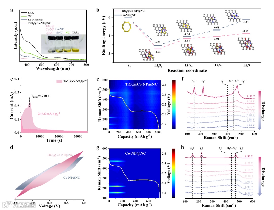 图3. 正极侧半电池性能表征 (a) TiO2@Co-NP@NC、Co-NP@NC、NC的吸附Li2S6溶液后的紫外光谱。(b) S8转化为Li2S过程的TiO2@Co-NP@NC和Co-NP@NC结合能。(c) TiO2@Co-NP@NC正极的Li2S沉积曲线。(d) 对称电池的CV曲线(扫描速率为50 mV s-1)。(e-h)以TiO2@Co-NP@NC和Co-NP@NC作为正极的半电池在5 mA电流密度下的电化学原位拉曼光谱。