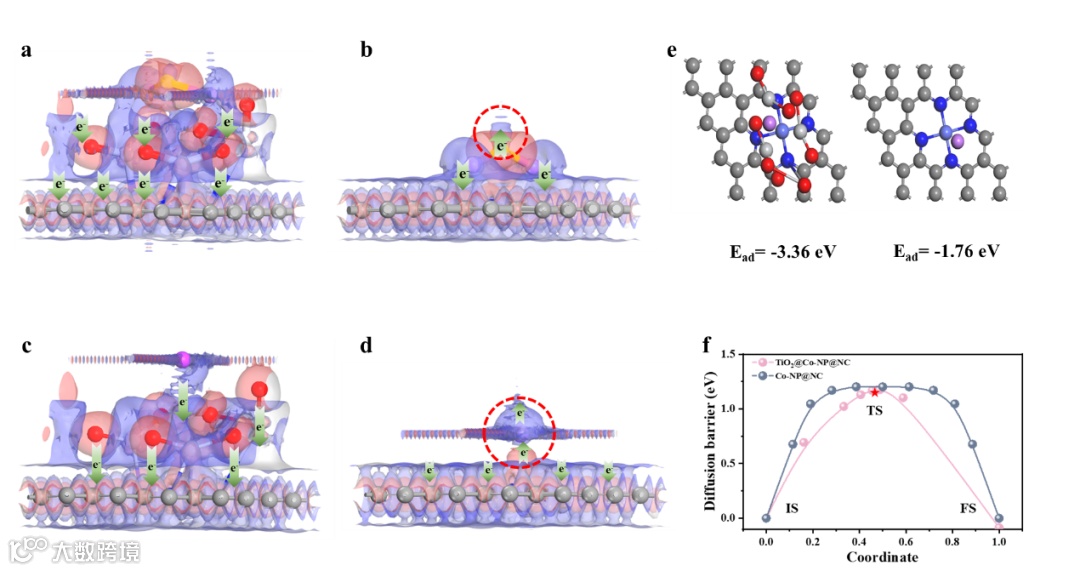 图2. (a) TiO2@Co-NP@NC和 (b) Co-NP@NC吸附Li2S吸附的电荷密度分布图。(c) TiO2@Co-NP@NC和(d) Co-NP@NC吸附Li原子的电荷密度分布图。(蓝色等面表示电荷积累,红色等面表示电荷消耗。(e) Li在TiO2@Co-NP@NC和Co-NP@NC表面的吸附能。(f) TiO2@Co-NP@NC和Co-NP@NC上的Li扩散势垒图。