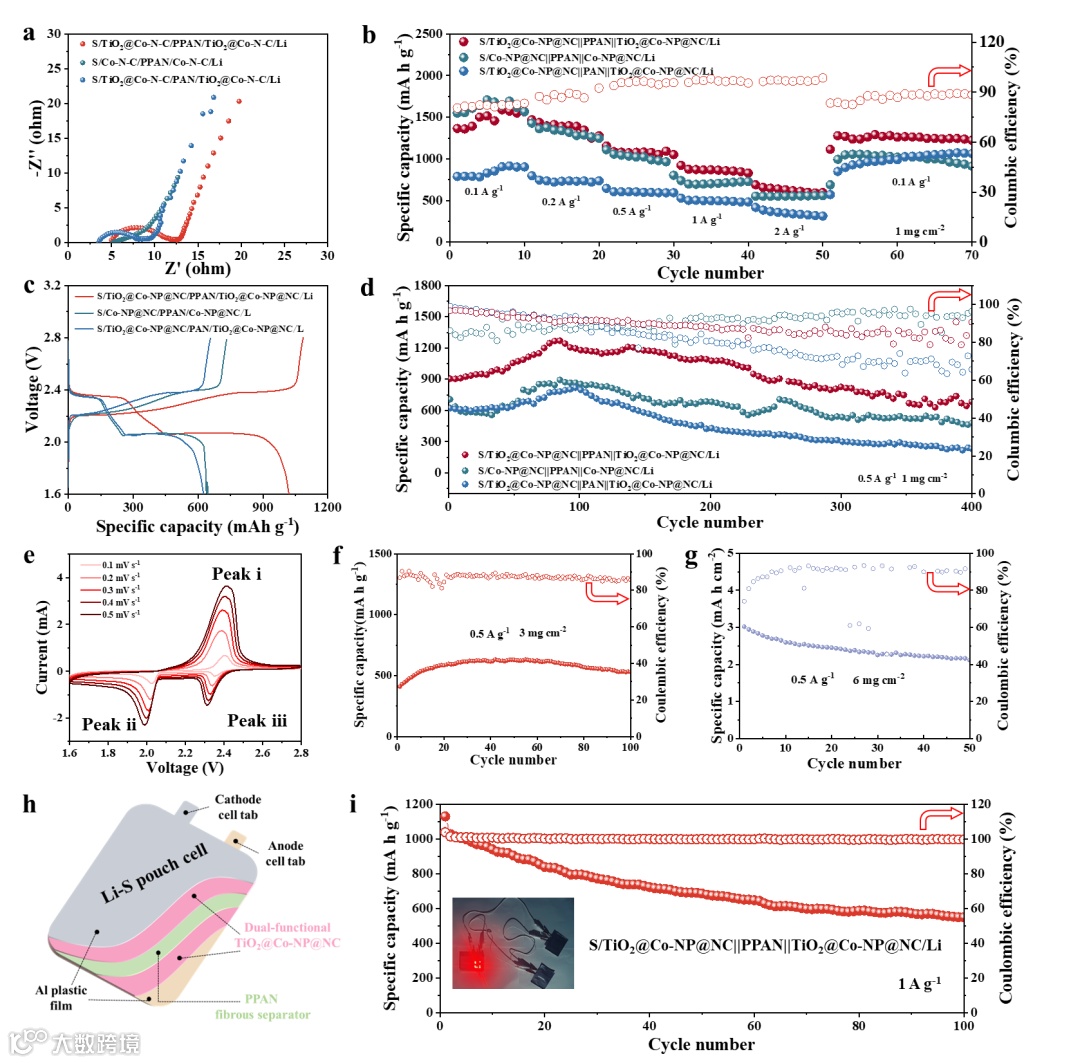 图5. 锂硫全电池的电化学性能。(a) 初始EIS曲线。(b) 在不同电流密度下的倍率曲线。(c) 0.5 A g-1电流密度下的恒流充放电曲线。(d) 0.5 A g-1电流密度下的长循环稳定性曲线。(e) S/TiO2@Co-NP@NC||PPAN||TiO2@Co-NP@NC/Li在不同扫速下的CV曲线。(f, g)S负载为3和6 mg cm-2时的循环性能曲线。(h)双功能TiO2@Co-NP@NC电极作正负极的软包电池示意图。(i) S/TiO2@Co-NP@NC||PPAN||TiO2@Co-NP@NC/Li软包全电池的循环性能曲线。
