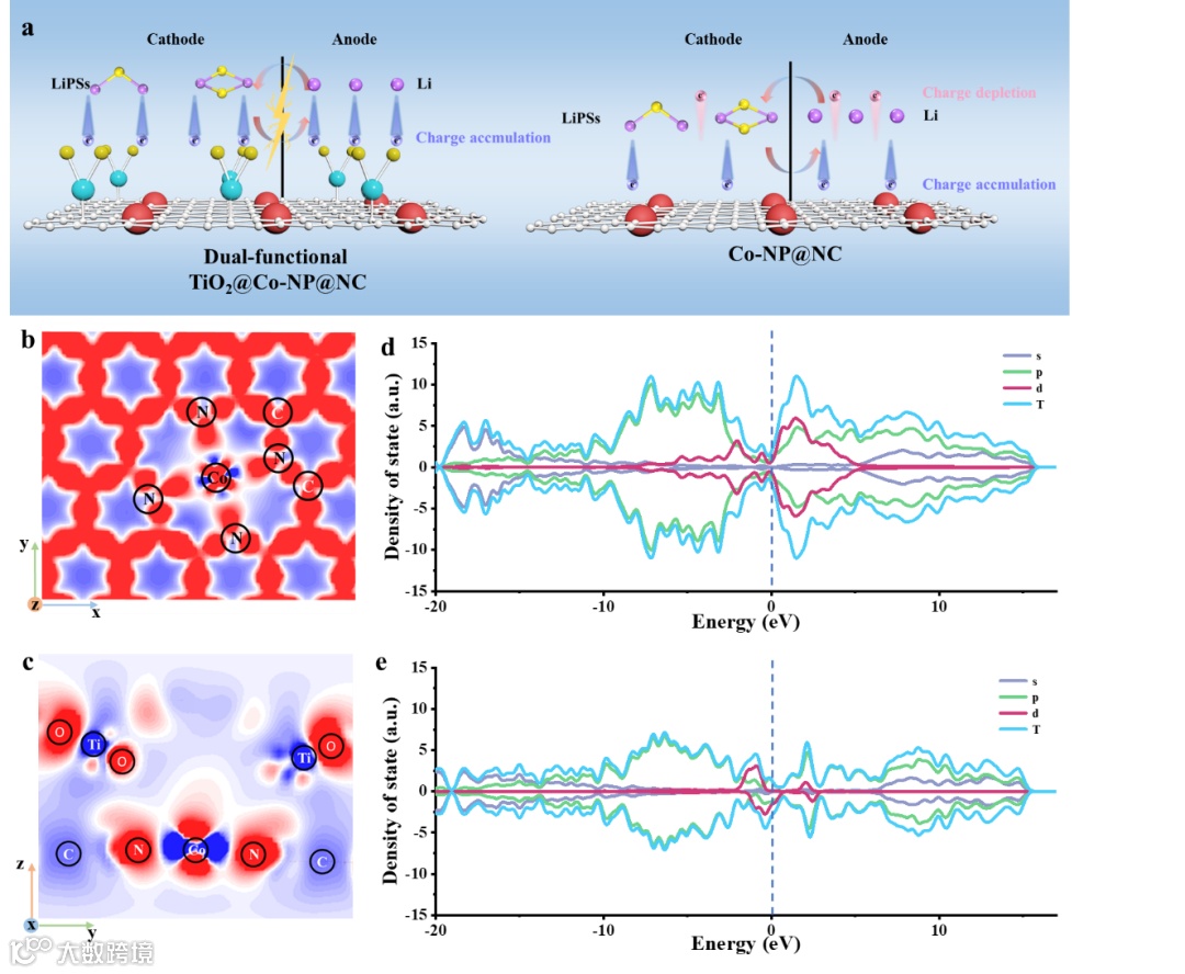 考虑自旋极化效应的pDOS在原子轨道上的投影结果表明,这种新型骨架结构的电子能带发生变化,能带能量的增加会提高电池的电子电导率和催化性能。值得注意的,TiO2@Co-NP@NC表现出更高的d轨道能量,导致耦合产生的反键能带增加,反键能量超过费米能级的比例更大。这表明TiO2增强了双功能电极与多硫化物和金属锂的键合稳定性,从而提高了其吸附能力。