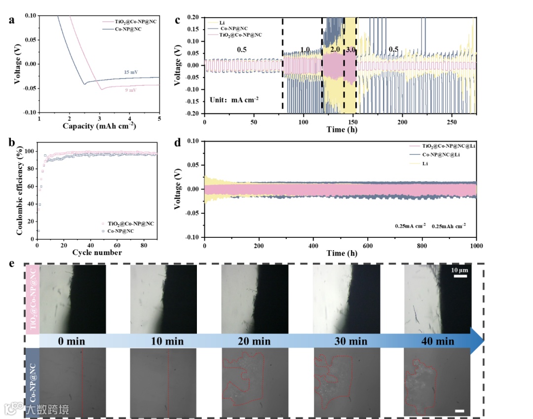 图4. 负极侧半电池性能表征(a) 在TiO2@Co-NP@NC和Co-NP@NC表面沉积Li的沉积曲线。(b) 在TiO2@Co-NP@NC和Co-NP@NC表面沉积Li的库仑效率。(c) 对称电池的倍率曲线。(d) 对称电池的恒流循环曲线。(e) 在TiO2@Co-NP@NC和Co-NP@NC纤维膜上沉积Li的光学原位显微图像。