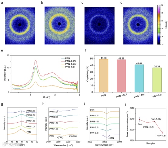 图2. CsPbX3增强聚丙烯腈薄膜的结构表征。(a-d)PAN、PAN-1.5Cl、PAN-1.5Br和PAN-1.5I的2D 掠入射广角X-射线散射图。(e) 聚合物薄膜的1D广角X-射线散射图。(f) 聚合物薄膜的结晶度。(g)PAN和PAN/CsPbI3的XRD谱图。PAN和PAN/CsPbI3在(h)3100-2800 cm-1和(i)2300-2200cm-1波数范围内的傅里叶变换红外光谱图。(j) PAN和PAN/CsPbX3薄膜中-CH2的峰值波数。