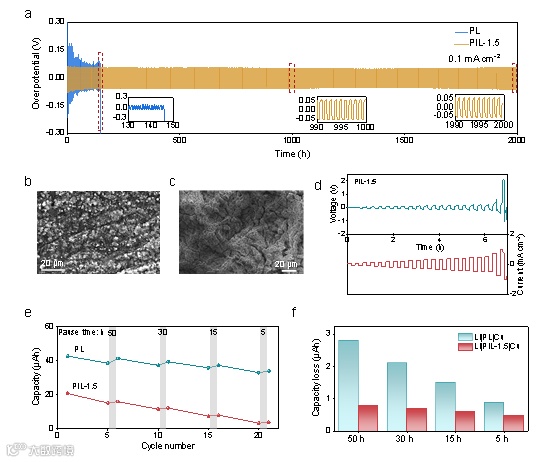 图5. 锂金属与PIL-1.5电解质之间的界面稳定性。(a)电流密度为0.1mA cm-2时Li|PL|Li-Li|PIL|Li电池的循环曲线。循环电池的FESEM图像:(b)循环150小时后的Li|PL|Li,(c)循环150小时之后的Li|PIL-1.5|Li。(d)Li|PIL-1.5|Li电池的临界电流密度测试曲线。(e)Li|PL|Cu和Li|PIL-1.5|Cu电池的SEI溶解性试验。(f)Li|PL|Cu和Li|PIL|Cu电池在SEI溶解性测试一定时间后的容量损失。