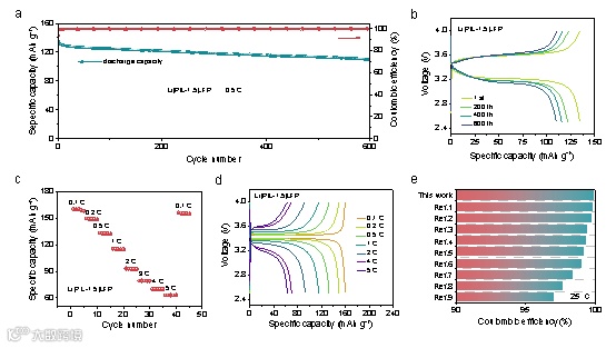 图6. Li|PIL-1.5|LFP电池的室温电化学性能。(a)0.5C下的循环性能。(b)不同循环下的充/放电曲线。(c)不同倍率下的放电比容量。(d)不同倍率下的充/放电曲线。(e)库仑效率与其他工作的比较。
