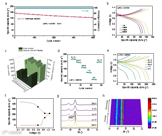 图7. Li|PIL-1.5|NCM电池的室温电化学性能。(a)0.5C下的循环性能。(b)不同循环时间下的充/放电曲线。(c)循环后容量保持率与其他工程的比较。(d)不同倍率下的放电比容量。(e)不同倍率下的充/放电曲线。(f-h)原位XRD图,验证了Li|PIL-1.5|NCM电池的优异循环稳定性。