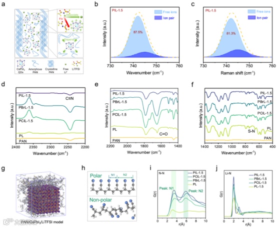 图3. CsPbX3量子点提高PAN基聚合物电解质锂离子传导能力的机理分析。(a)CsPbX3量子点解离Li盐的示意图。(b)拟合的PIL-1.5电解质的FT-IR峰。(c)拟合的PIL-1.5电解质的拉曼光谱峰。PIL-1.5电解质在(d)2400-2200 cm-1、(e)2100-1500 cm-1、(f)1400-400 cm-1处的傅里叶变换红外光谱图。(g)优化后的PIL-1.5体系的分子动力学模型结构图。(h) 极性和非极性PAN分子,其中N1和N2表示相邻N原子和下一个最近相邻N原子的距离。(i-j)N-N和Li-N原子的RDF。