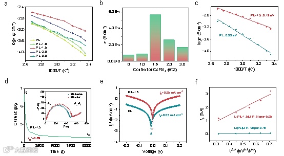 图4为PL和PIL聚合物电解质的电化学性能。简而言之,CsPbI3量子点的空间位阻和路易斯酸碱相互作用之间的平衡作用,抑制了PAN链段的结晶和促进了更多游离Li离子的产生,大大提高了Li离子的解离、转移和传导能力。