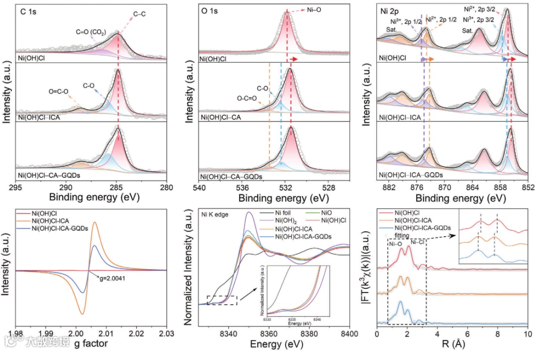 XPS结果表示,随着间隙碳的引入,Ni-O、C-OH和O-C=O的结合能降低,氧原子周围的电子云密度增加,核与自由电子的相互作用减少,氧化还原反应活性增强。而GQDs掺杂不会改变Ni2+/Ni3+的结合能位置。EXAFS拟合曲线和R空间结果表明,引入间隙碳后,Ni-O和Ni-Cl键长减小;EPR结果显示引入ICAs后氧缺陷增加,导致Ni的配位数从6减少到5。进一步添加GQDs后,由于LDH中的Ni和GQDs中的O之间的配位,Ni的配位数变回6。这些结果表明ICAs与GQDs的成功结合,显著影响了Ni与其他原子之间的配位关系及材料的电子结构,这可能会影响Ni的氧化还原活性和层状结构的稳定性。