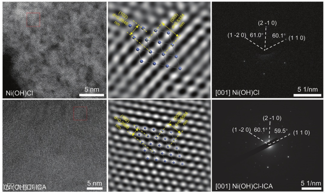 与 Ni(OH)Cl结构相比,Ni(OH)Cl-ICA结构的晶格条纹更加清晰,表明Ni(OH)Cl-ICA结构内的结晶度增强且原子力更强。此外,相应的FFT图像显示(0 0 3)面间距从0.5324 nm增加到0.5564 nm,而(1 0 2)面间距从0.2846 nm减少到0.2688 nm,表明层间距扩大,层内结构压缩。选区电子衍射(SAED)图像证实了Ni(OH)Cl和Ni(OH)Cl-ICA的六方构型,同时表明ICA的插入不会改变单晶结构。此外,沿[001]带轴的分析表明,(1 -2 0)、(2 -1 0) 和(1 1 0)平面之间的角度随着ICA掺杂而减小。这一结果进一步证实了层内结构的收缩,并证明ICA在Ni(OH)Cl晶格中产生了微应变。