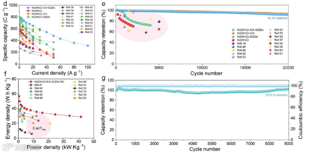 对材料进行倍率性能测试发现,Ni(OH)Cl-ICA-GQDs在50 A g−1时可达到480 C g−1 (1022 F g−1),比Ni(OH)Cl高近三倍,优于大多数其他报道的镍基材料。即使在100 A g−1的极高电流密度下,比容量保持率也能达到39.7%。同时,Ni(OH)Cl-ICA-GQDs在20000次循环后保留了91.5%的初始容量,Ni(OH)Cl-ICA在20000次循环后保留了93.5%,远高于Ni(OH)Cl在2000次循环后的70.3%及 Ni(OH)Cl-GQDs在4000 次循环后的71.4% 和其他报道的镍基材料电极。以Ni(OH)Cl-ICAGQDs为正极,活性炭(AC)作为负极构建了Ni(OH)ClICA-GQDs//AC HSC,在41.5 kW kg−1的能量密度下具有28.8 Wh kg−1的高功率密度。此外,在9000次循环后最大比容量保留102.5%。Ni(OH)Cl-ICA-GQDs//AC HSC的所有这些性能都表明在储能设备的进一步实际应用中具有巨大潜力。