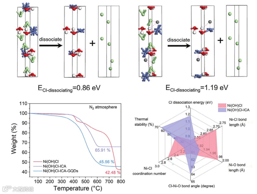 为了验证结构稳定性的变化,进行了密度泛函理论(DFT)计算来探索体系能量变化和结构变化。理论上,Ni(OH)Cl中Cl原子的解离能掺杂ICA后由0.86 eV增加至1.19 eV,表明Cl与周围原子之间的相互作用增强。此外,优化后的Ni(OH)Cl-ICA模型表明引入ICA后Ni-Cl键的键长从2.701减少到2.544 Å,而Ni-O键长从1.986减少到1.934 Å。在室温至800 °C范围内进行的热重分析(TGA)进一步支持了稳定性增强的实际证据。Ni(OH)Cl-ICA的热稳定性为 64.31%,明显高于 Ni(OH)Cl 的 42.48%,这些发现强调了ICA在增强层状结构稳定性方面的重要作用。