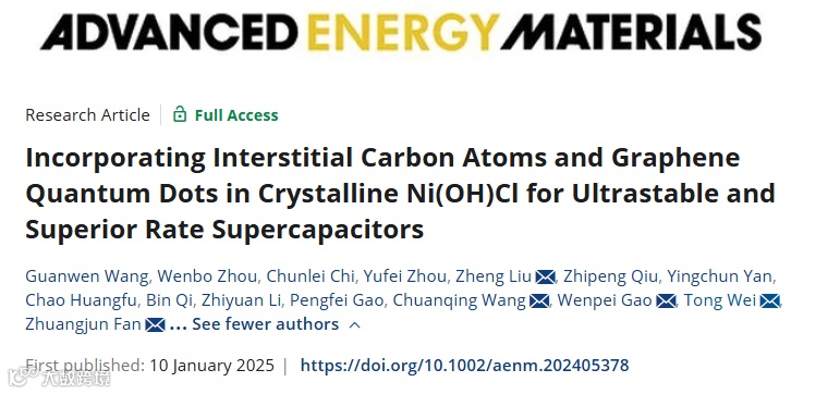 近日,来自中国石油大学(华东)的范壮军和魏彤、上海交通大学高文旆、合肥综合性国家科学中心能源研究院王传庆、扬州大学刘征合作,在国际知名期刊Advanced Energy Materials 上发表题为“Incorporating Interstitial Carbon Atoms and Graphene Quantum Dots in Crystalline Ni(OH)Cl for Ultrastable and Superior Rate Supercapacitors”的研究工作。该工作将Ni(OH)Cl与间隙碳原子(ICAs)和石墨烯量子点(GQDs)结合,从根本上改变其结构稳定性和电子输运能力。ICAs的引入在晶格内产生微应变,从而提高了解离能和结构稳定性。同时,富电子GQDs作为模板,构建快速传质通道并优化电子分布。这种协同方法可以从本质上稳定层状结构并增强离子和电子的传输动力学,为高性能储能器件的开发提供新的见解。