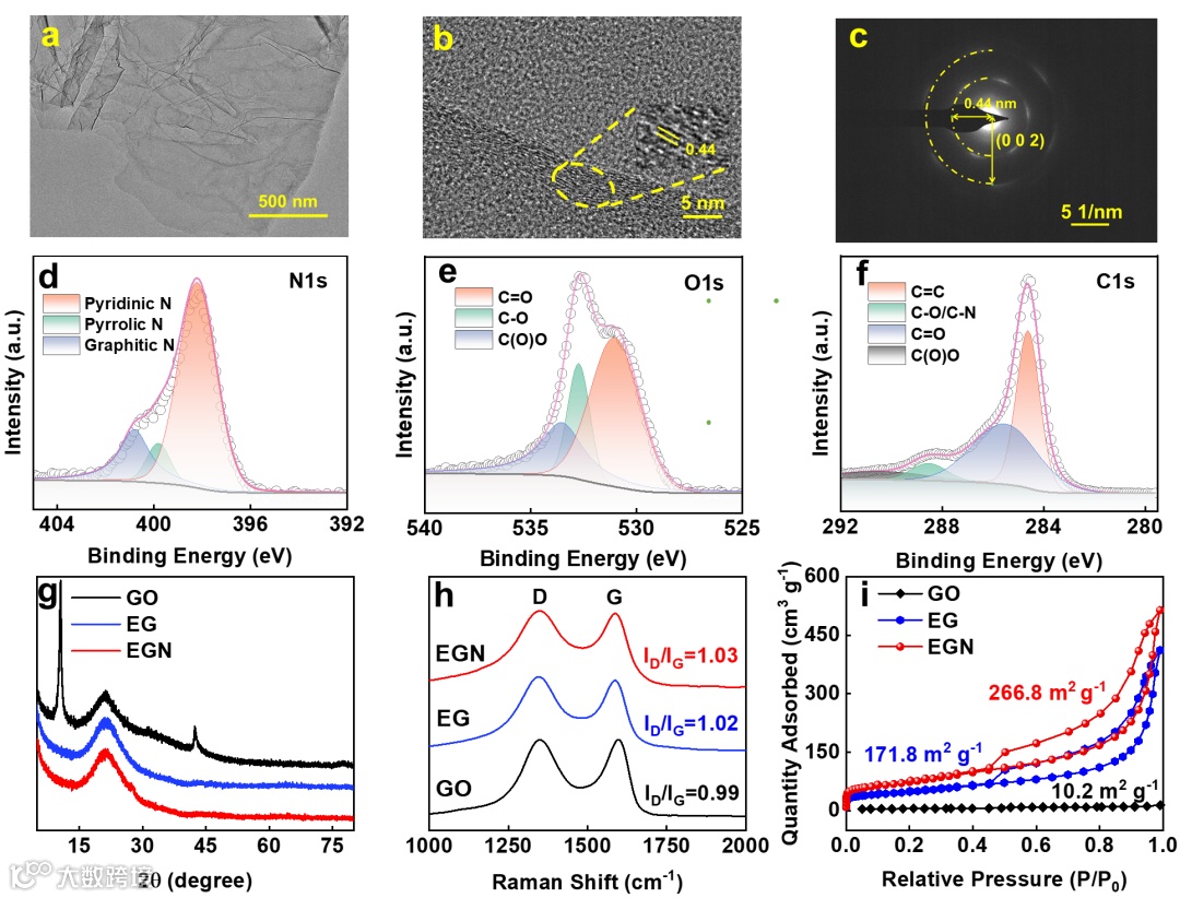 图 2. (a) EGN 的TEM图像;(b) EGN的HRTEM 图像;(c) EGN的SAED图案;(d) GO、EG 和 EGN 的 XRD图案和;(e)拉曼光谱;(f) EGN、EG 的 N2 吸附和解吸等温线;EGN的高分辨率XPS光谱 (g) N1s;(h) O1s;(i) C1s。