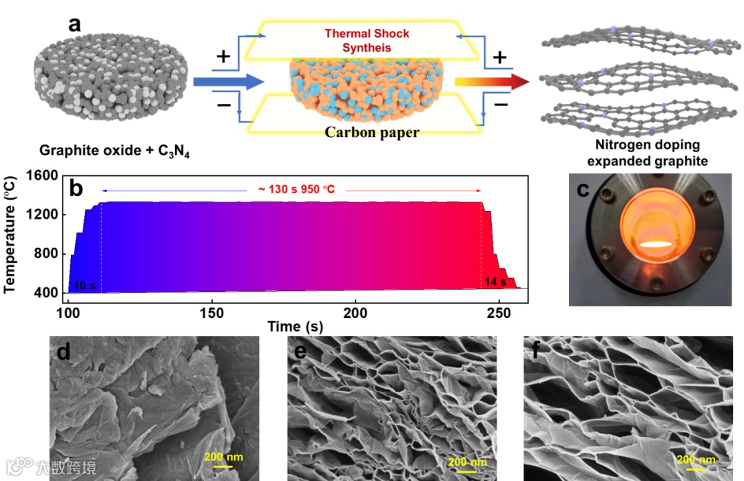 图1。(a) 利用HTS技术制备EGN的过程示意图;(b) HTS升温曲线;(c) 高温加热过程的数码照片;(d-f)GO、EG、EGN的SEM图像。