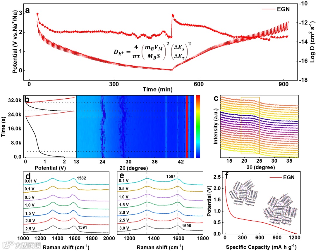图4. (a) EGN电池的GITT曲线和相应的离子扩散系数对数值。(b,c) 前两周循环中EGN电池的GCD曲线和等高线图;(d,e) 第一次充电/放电过程中EGN电池的非原位拉曼光谱图;(f) 放电曲线(0.1 A g−1);