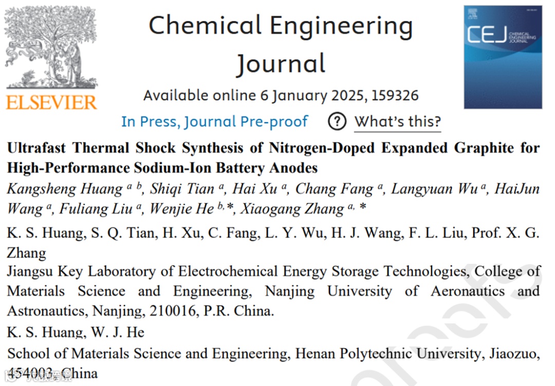 基于此,南京航空航天大学张校刚教授团队,在国际知名期刊Chemical Engineering Journal上发表题为“Ultrafast Thermal Shock Synthesis of Nitrogen-Doped Expanded Graphite for High-Performance Sodium-Ion Battery Anodes”的文章。在这项研究中,团队结合高温热冲击(HTS)和氮掺杂两种策略,以氧化石墨为原料,开发了一种膨胀石墨负极材料的快速制备方法并成功应用于SIBs。电镜表征结果显示,合成的氮掺杂膨胀石墨(EGN)保持了类石墨的层状结构并且增加了层间距,为Na⁺的电化学插入提供了理想的通道。电化学测试表明EGN在0.05 A g⁻¹电流密度下可提供322 mAh g⁻¹的高可逆容量,并在1.0 A g⁻¹下循环1000次后仍保持了115 mAh g⁻¹的容量发挥。原位X射线衍射(XRD)和非原位拉曼分析揭示了钠化/脱钠过程中微观结构的动态演变。本研究制备的EGN兼具高效电化学性能和低碳制备优势,展现出在下一代SIBs负极材料应用中的巨大潜力。