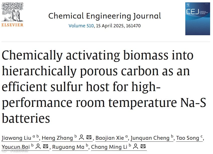 针对此问题,苏州科技大学的青年教师张恒、拜有存副教授、李长明院士提出了对木质纤维碳的化学活化法的改进思路,并在国际知名期刊Chemical Engineering Journal上发表题为“ Chemically activating Biomass into Hierarchically Porous Carbon as an Efficient Sulfur Host for High-Performance Room Temperature Na-S Batteries “的研究论文。