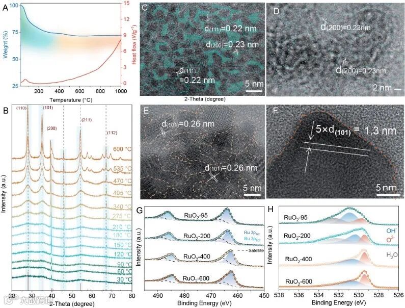 图3. A ) RuO₂的TG-DSC曲线。B ) 不同退火温度RuO₂的原位XRD图谱。C-F )热处理前后RuO₂ 的HRTEM图像:C ) RuO₂-95,D ) RuO₂-200,E ) RuO₂-400,F ) RuO₂-600。G ) Ru 3p和H ) O 1S的高分辨XPS。