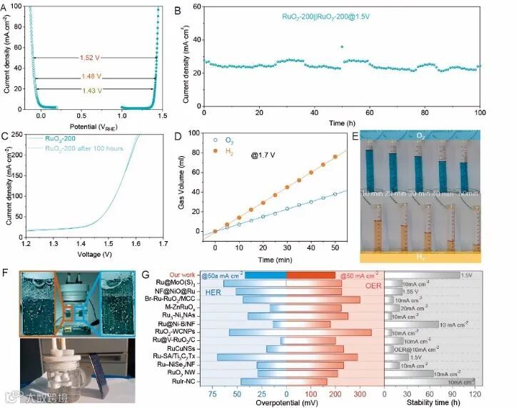 图5. A ) HER和OER极化曲线。B ) 1.5 V下RuO₂-200分解水的i-t曲线。C )计时电流法测试100 h前后RuO₂-200分解水的极化曲线。D ) 使用RuO₂-200在1.7 V槽电压下产生的O2和H2的气体体积。E) 不同工作时间下的相应照片。F) Zn-Mn电池( 1.5 V )和太阳能电池在自然光照下在RuO₂-200上分解水照片。G )Ru基催化剂和RuO₂-200 HER /OER在10 mA cm-2下过电位和稳定性对比图。