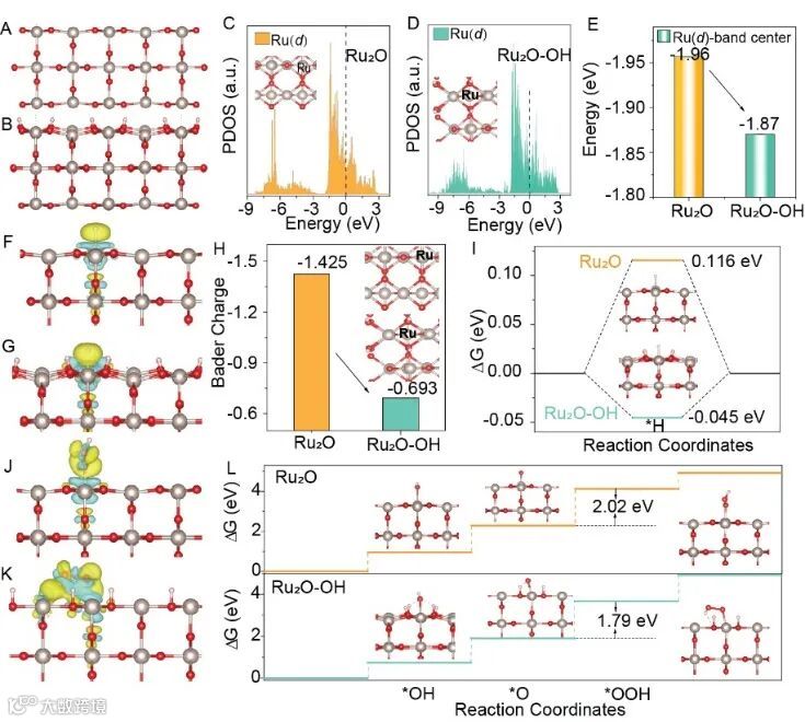 图4. A ) RuO₂的几何构型;B ) RuO₂-OH . C ) RuO₂中Ru-d态的PDOS图。D ) RuO₂-OH中Ru-d态的PDOS图。E ) RuO₂和RuO₂-OH的Ru-d带中心。F,G )分别为* H- RuO₂和*H-RuO₂-OH的电子电荷差。H ) RuO₂和RuO₂-OH的Bader电荷。I ) H在RuO₂和RuO₂-OH上的吸附自由能。J,K )分别为*OOH-RuO₂和*OOH-RuO₂-OH的电子电荷差。L ) OER过程RuO₂和RuO₂-OH催化剂的吉布斯自由能图。