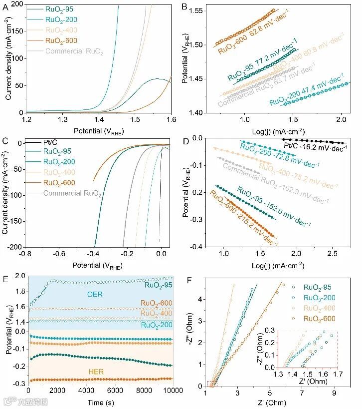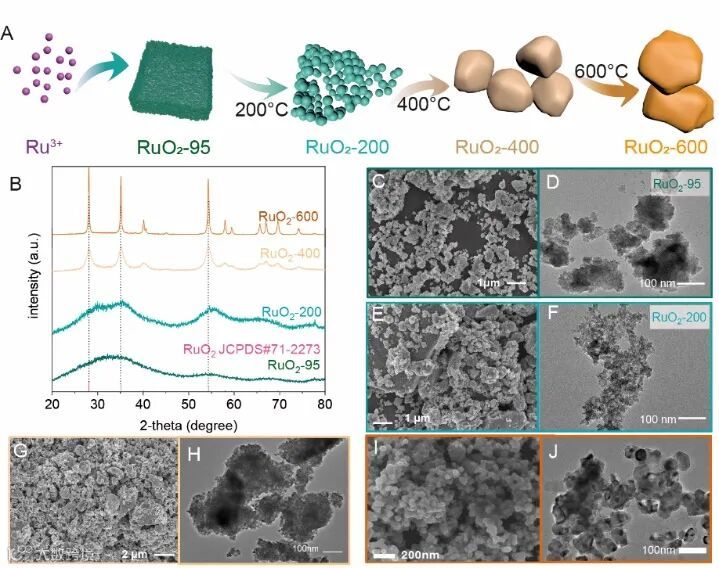 图1. A ) RuO2纳米晶制备示意图。B ) RuO2纳米晶XRD图谱。C-J ) RuO2纳米晶SEM图和TEM图:C-D ) RuO2-95,E-F ) RuO2-200,G-H ) RuO2-400,I-J ) RuO2-600。