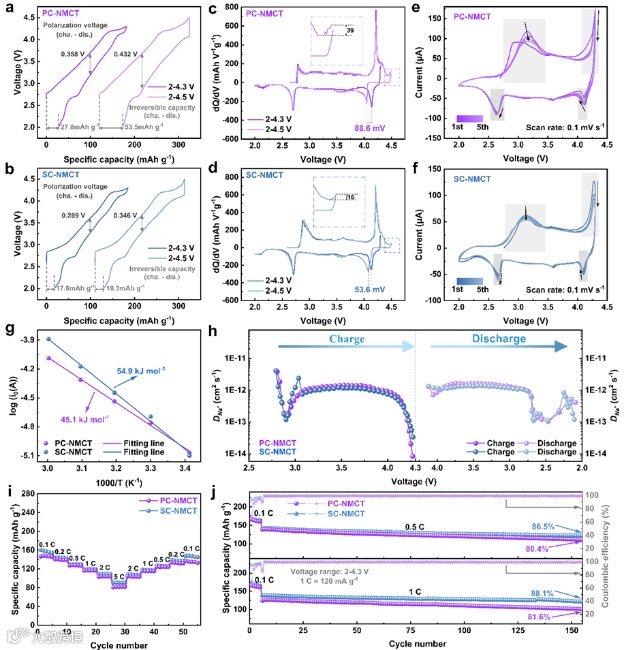 通过在2-4.3V及2-4.5V电压区间内的首圈充放电曲线及对应的dQ/dV曲线可以得到,SC-NMCT在更高截止电压下拥有更小的电压极化及容量损失。调整电压区间为2-4.3V时, SC-NMCT前5圈的CV曲线中氧化还原峰的衰减及偏移更小。这些共同展现出SC-NMCT更为优异的高压稳定性。动力学测试表明在常规电压区间内,大尺寸单晶并没有显著降低Na+的扩散动力学,反而对于高电压下的动力学下降有一定的抑制作用。故所得SC-NMCT表现出不输PC-NMCT的倍率性以及更为优异的循环稳定性。