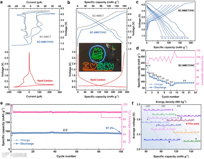 SC-NMCT在和硬碳组装而成的全电池中,表现出优异的电化学性能。