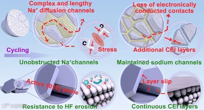 当前,钠离子电池因其高经济效益、丰富的资源以及较好的电化学性能而被广泛关注,尤其在大规模能源存储系统中具有巨大的潜力。然而,钠离子电池的高能量密度和长循环寿命仍然是其应用的关键挑战。在高电压下,层状氧化物正极面临晶格氧不可逆损失、电极与电解质界面副反应等问题。同时,由于钠离子嵌入/脱出过程中的各向异性晶格膨胀和收缩会引起严重的体积变化,造成二次颗粒内应力积累。此外,取向各异的Na+通路及晶界不仅限制了Na+的扩散,也使颗粒内Na+分布不均,产生内应力和局部晶格失配。随着循环过程的进行逐渐产生晶间裂纹和晶内裂纹,加速电解液渗透和界面副反应,造成正极材料的失效。当前钠离子电池中主要通过元素掺杂或表面包覆缓解体积变化和界面稳定性问题,但这无法解决材料本身存在的问题。