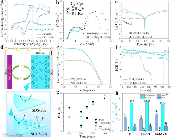 Figure 4 Performances of SL/PEDOT as CEs in DSSCs: a) CV curves of SDS-30s and SL1.5-30s; b) Nyquist plots; c) Tafel curves; d) Assembly diagram of DSSCs; e) J-V curves; f) PCE curves over time; g-h) comparative analysis of SL1.5-30s with reported Pt and PEDOT.