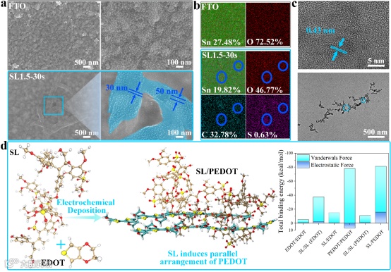 Figure 2 Microstructure and molecular orientation of SL/PEDOT CEs: a) SEM images of FTO and SL1.5-30s; b) EDS mapping of FTO and SL1.5-30s; c) TEM images of SL1.5-30s; d) Molecular dynamics simulation analysis.